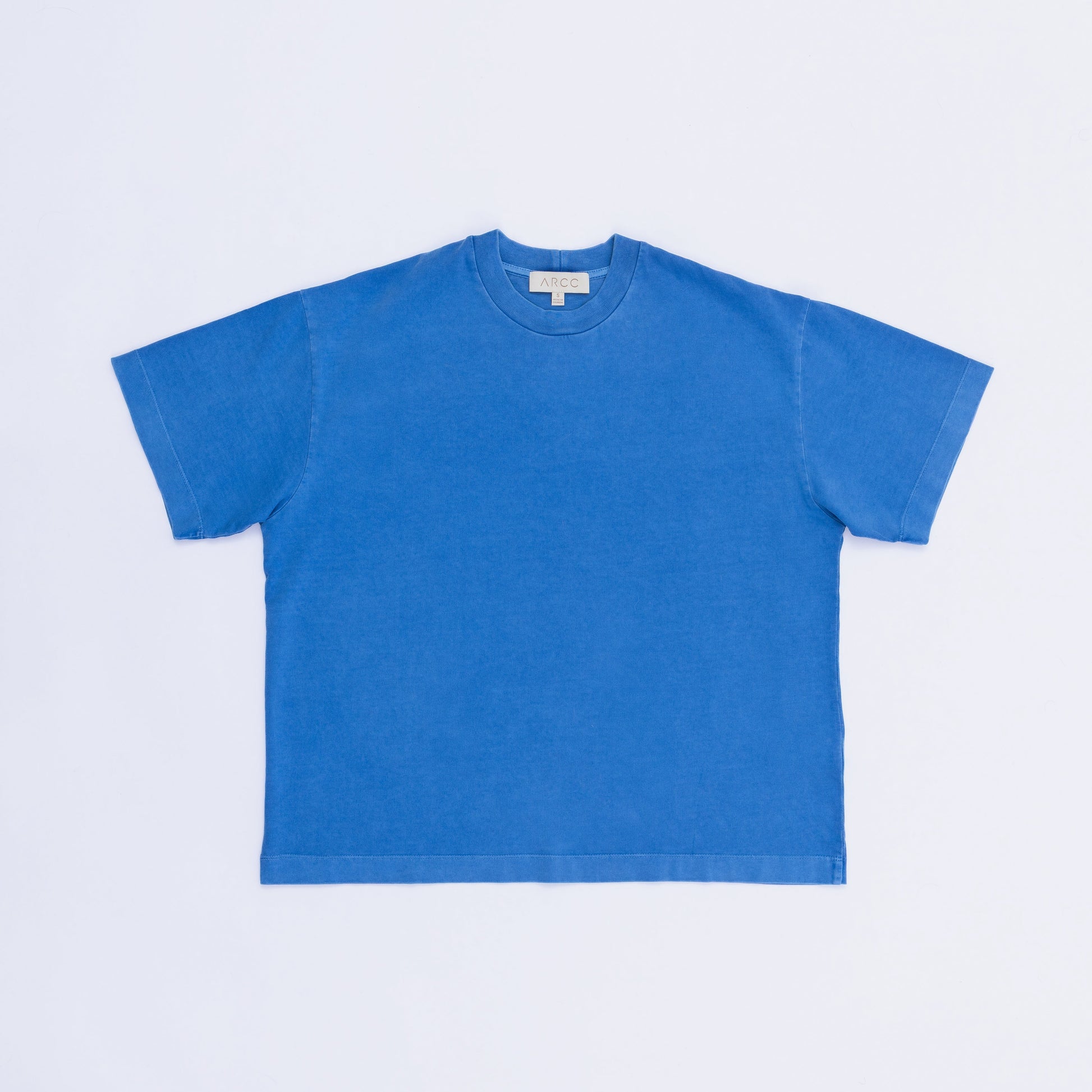 Camiseta manga corta cuello redondo silueta boxy con las costuras de los hombros trasladadas a la espalda, tiene un un lavado que le da su color azul eléctrico y aspecto usado, en el centro superior de la espalda tiene estampada una ilustración de una flor en policromía.